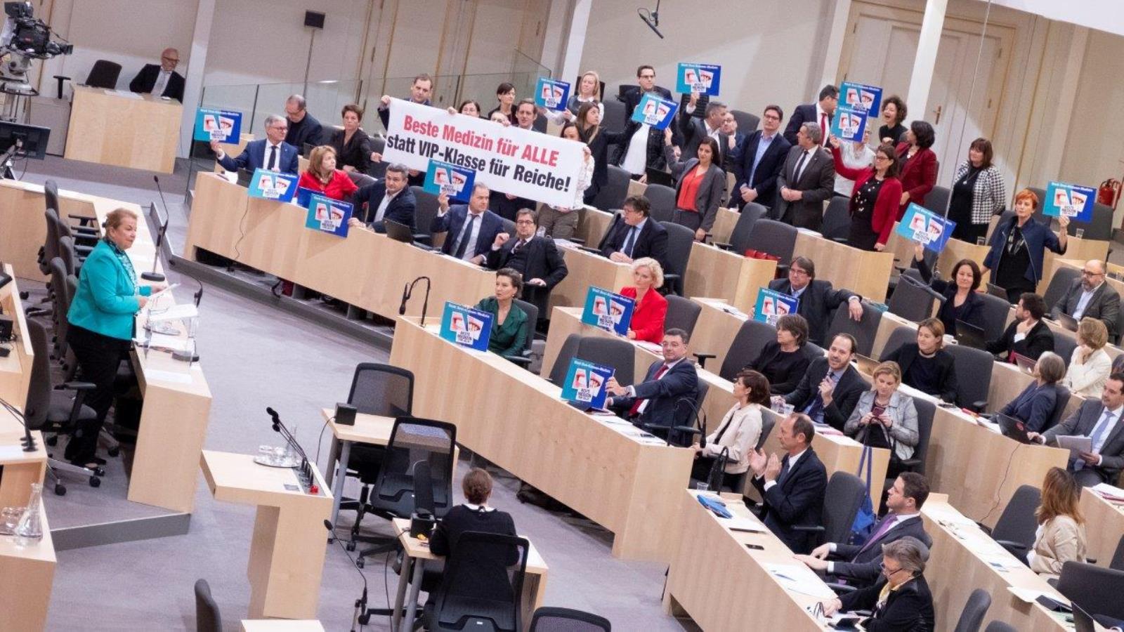 Aktion der SPÖ im Plenarsaal: „Beste Medizin für alle statt VIP-Klasse für die Reichen!“